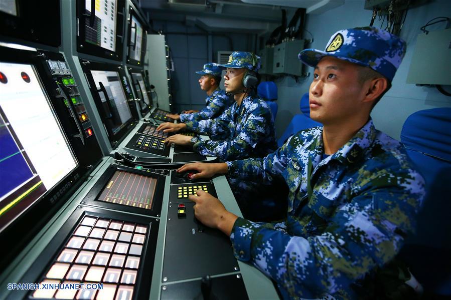 MAR MERIDIONAL DE CHINA, julio 8, 2016 (Xinhua) -- Soldados navales chinos buscan objetivos acerca del destructor de misiles Hefei durante un ejercicio militar llevado a cabo en la zona de aguas cerca de la isla de Hainan y las islas de Xisha de China, el 8 de julio de 2016. La Marina china realizó este viernes un ejercicio de combate anual en la zona de aguas cerca de la isla de Hainan y las islas de Xisha de China. (Xinhua/Zha Chunming)