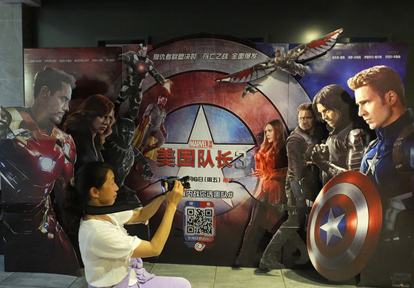 Una mujer ahce fotos del cartel de Capitán América: la Guerra Civil en un cine de Yichang, provincia de Hubei, el 11 de mayo de 2016. [Foto de China Daily]