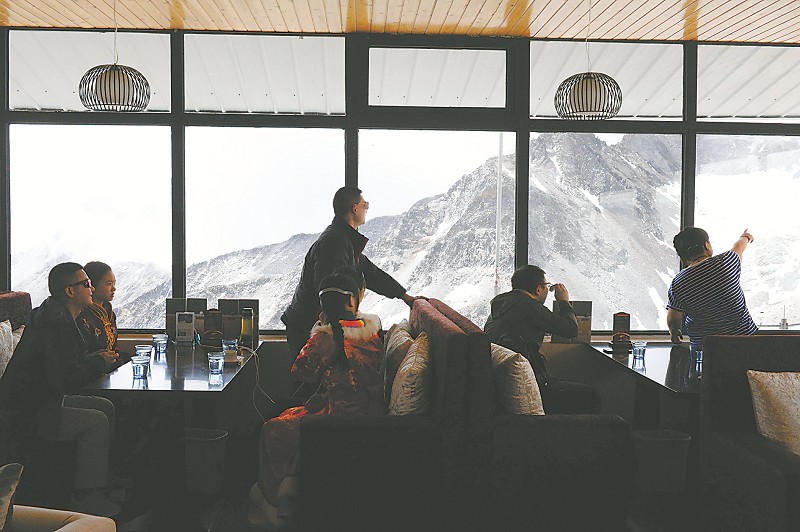 Varios viajeros provenientes de la provincia china de Sichuan disfrutan del paisaje esplendido del Glaciar Dagu desde el interior de la cafetería más alto del mundo, a la que llaman los internautas la cafetería más solitaria en el mundo.
