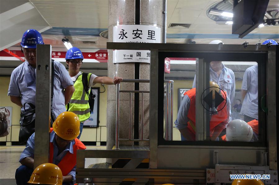 Trabajadores instalan barreras de seguridad en la estación Yong'anli de la línea 1 del metro de Beijing, el 18 de julio de 2016. La capital comenzó a instalar barreras en las plataformas de la línea 1 del metro, la más antigua del país, donde se han producido varios suicidios y accidentes en los últimos a?os. El proyecto estará completado a finales de 2017, dijo la empresa operadora de la línea. (Xinhua/Luo Xiaoguang)