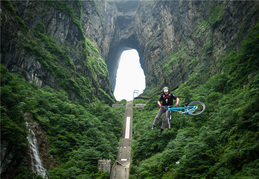 El ciclista estadounidense realiza un salto en la categoría de habilidades, en la carrera de bicicletas Red Bull Tianmen Mountain en Zhangjiajie, provincia de Hunan. [Foto/Xinhua]