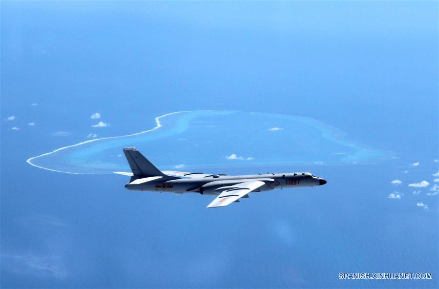 MAR MERIDIONAL DE CHINA, julio 18, 2016 (Xinhua) -- Imagen sin fechar de un bombardero H-6K chino patrullando islas y arrecifes, incluyendo Huangyan Dao, en el Mar Meridional de China. La fuerza aérea del Ejército Popular de Liberación (EPL) de China realizó recientemente un patrullaje aéreo de combate en el Mar Meridional de China, lo cual se convertirá en una práctica "regular" en el futuro, informó el lunes un vocero militar. El EPL envió bombarderos H-6K y otros aviones, incluyendo cazas, aviones de reconocimiento y aviones cisterna a patrullar islas y arrecifes, incluyendo Huangyan Dao, dijo Shen Jinke, vocero de la fuerza aérea del EPL. (Xinhua/Liu Rui)