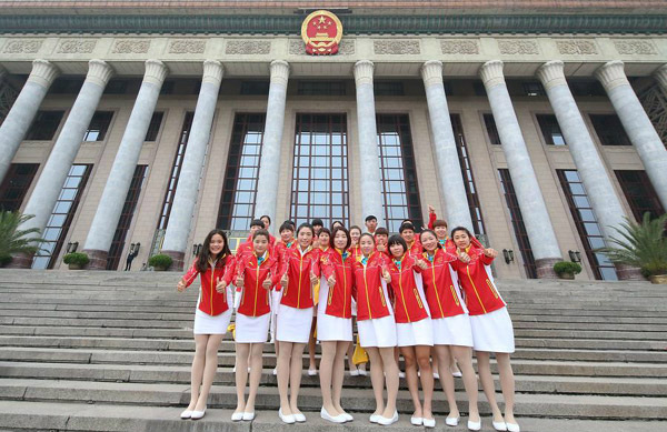 El equipo de hockey femenino posa ante el Gran Salón del Pueblo. [foto/China Daily]