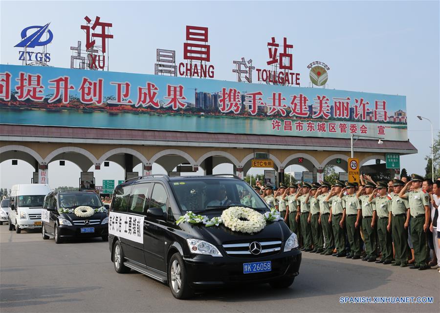 Dos carrozas fúnebres cargan los féretros de dos soldados chinos de mantenimiento de paz de la Organización de las Naciones Unidas (ONU), quienes murieron en un reciente enfrentamiento en Sudán del Sur, en Xuchang, en la provincia central de Henan, China, el 20 de julio de 2016. Los cuerpos del cabo Li Lei, de 22 a?os de edad, y del sargento mayor Yang Shupeng, de 33 a?os, quienes murieron durante enfrentamientos entre las tropas del gobierno del presidente Salva Kiir y las fuerzas leales al vicepresidente Riek Machar, en Juba, capital sursudanesa, fueron enviados de vuelta a China en un vuelo chárter especial. (Xinhua/Zeng Tao)