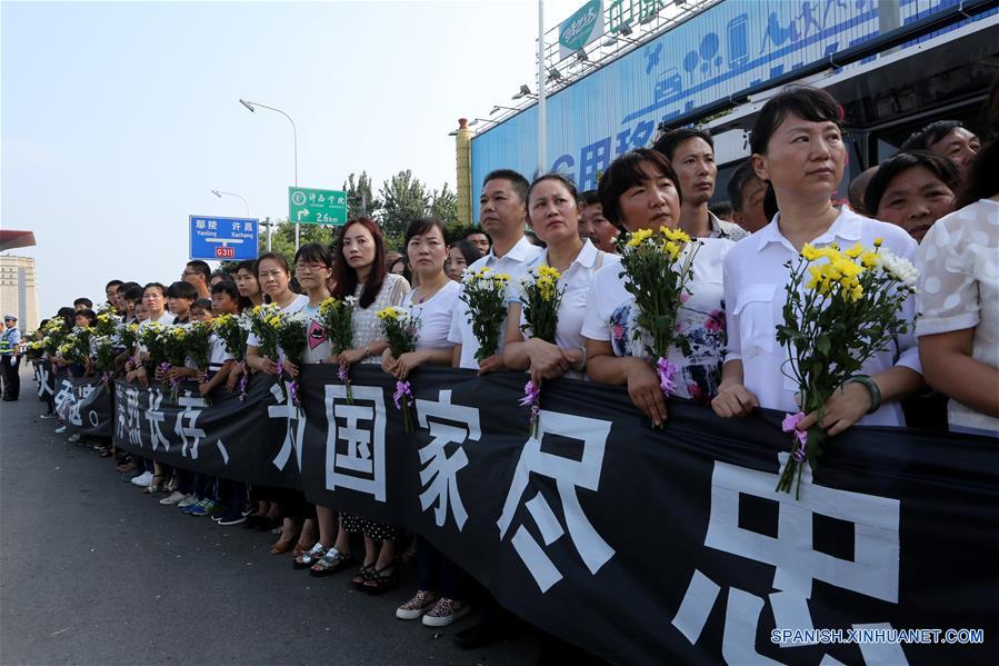 Residentes esperan el paso de las carrozas fúnebres con los féretros de dos soldados chinos de mantenimiento de paz de la Organización de las Naciones Unidas (ONU), quienes murieron en un reciente enfrentamiento en Sudán del Sur, en Xuchang, en la provincia central de Henan, China, el 20 de julio de 2016. Los cuerpos del cabo Li Lei, de 22 a?os de edad, y del sargento mayor Yang Shupeng, de 33 a?os, quienes murieron durante enfrentamientos entre las tropas del gobierno del presidente Salva Kiir y las fuerzas leales al vicepresidente Riek Machar, en Juba, capital sursudanesa, fueron enviados de vuelta a China en un vuelo chárter especial. (Xinhua/Zeng Tao)