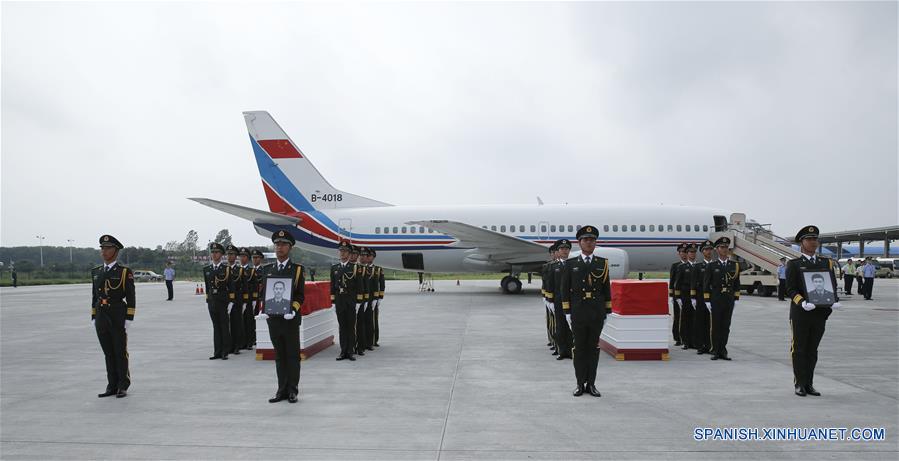 Una guardia de honor permanece alrededor de los féretros de los dos soldados chinos de mantenimiento de paz de la Organización de las Naciones Unidas (ONU, en una ceremonia en el Aeropuerto Internacional Zhengzhou Xinzheng, en Zhengzhou, capital de la provincia central de Henan, China, el 20 de julio de 2016. El miércoles una ceremonia fue llevada a cabo para recibir los cuerpos del cabo Li Lei, de 22 a?os de edad, y el sargento mayor Yang Shupeng, de 33 a?os, quienes murieron durante un enfrentamiento reciente en el conflicto que afecta a Sudán del Sur. (Xinhua/Yin Gang)