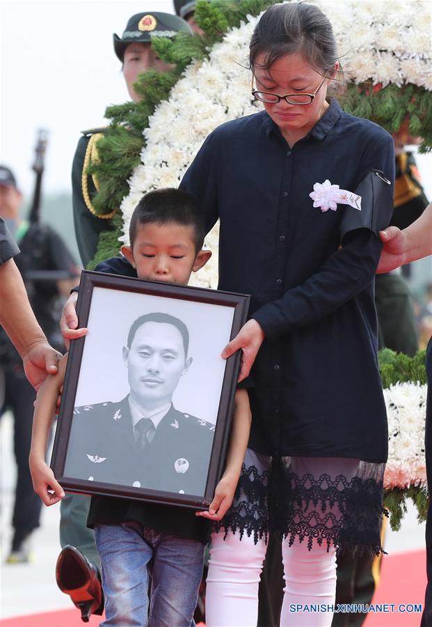 El hijo del soldado chino de mantenimiento de paz de la Organización de las Naciones Unidas (ONU) Yang Shupeng, acompa?ado por Zou Lina, esposa de Yang, carga su retrato durante una ceremonia en el Aeropuerto Internacional Zhengzhou Xinzheng, en Zhengzhou, capital de la provincia central de Henan, China, el 20 de julio de 2016. El miércoles una ceremonia fue llevada a cabo para recibir los cuerpos del cabo Li Lei, de 22 a?os de edad, y el sargento mayor Yang Shupeng, de 33 a?os, quienes murieron durante un enfrentamiento reciente en el conflicto que afecta a Sudán del Sur. (Xinhua/Yin Gang)