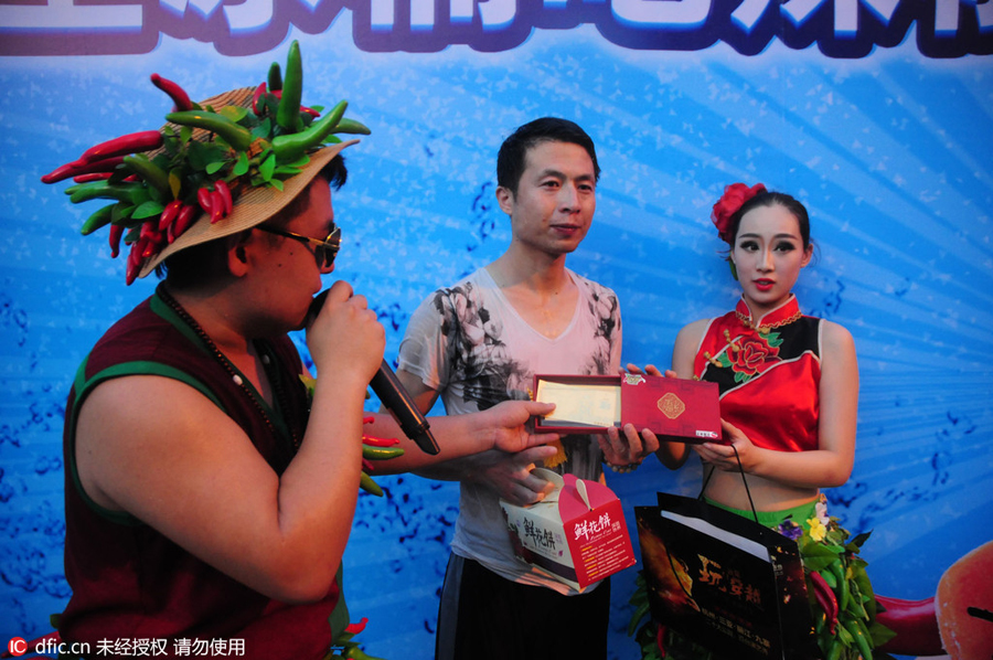 El campeón del reto, que comió 62 pimientos picantes en 3 minutos, posa para las cámaras después del reto celebrado en Hangzhou, provincia de Zhejiang, el 20 de julio de 2016. [Foto/IC]