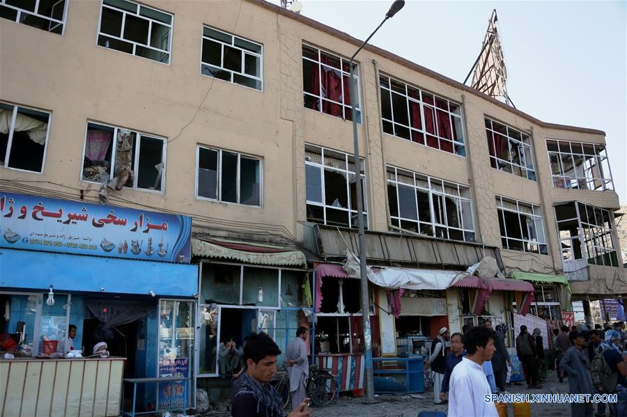 Personas permanecen frente inmuebles da?ados en el lugar donde se registró una explosión, en Kabul, capital de Afganistán, el 23 de julio de 2016. Por lo menos 61 personas perdieron la vida y 207 resultaron heridas en un ataque explosivo ocurrido el sábado durante una protesta en Kabul, la capital de Afganistán, informó un funcionario del sector de salud de Afganistán. (Xinhua/Rahmat Alizadah)
