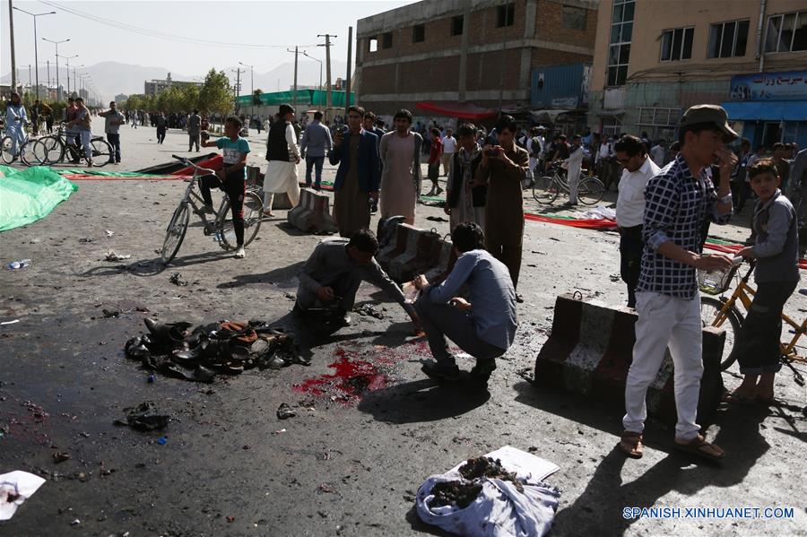 Personas recogen las pertenencias de las víctimas en el lugar donde se registró una explosión, en Kabul, capital de Afganistán, el 23 de julio de 2016. Por lo menos 61 personas perdieron la vida y 207 resultaron heridas en un ataque explosivo ocurrido el sábado durante una protesta en Kabul, la capital de Afganistán, informó un funcionario del sector de salud de Afganistán. (Xinhua/Rahmat Alizadah)