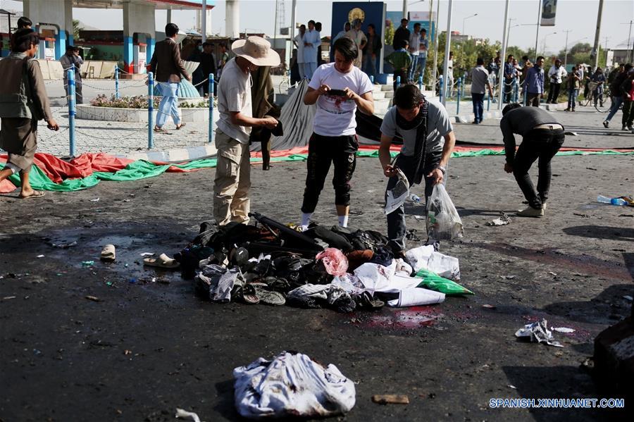 Personas recogen las pertenencias del las víctimas en el lugar donde se registró una explosión, en Kabul, capital de Afganistán, el 23 de julio de 2016. Por lo menos 61 personas perdieron la vida y 207 resultaron heridas en un ataque explosivo ocurrido el sábado durante una protesta en Kabul, la capital de Afganistán, informó un funcionario del sector de salud de Afganistán. (Xinhua/Rahmat Alizadah)