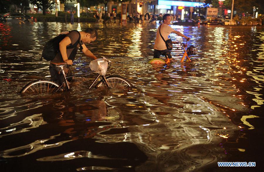 Residentes intentan cruzar una calle de Xian, capital de la provincia de Shaanxi. Las tormentas del domingo por la noche inundaron muchas zonas de Xian, causando importantes atascos en la capital provincial. (Xinhua/Tao Ming)