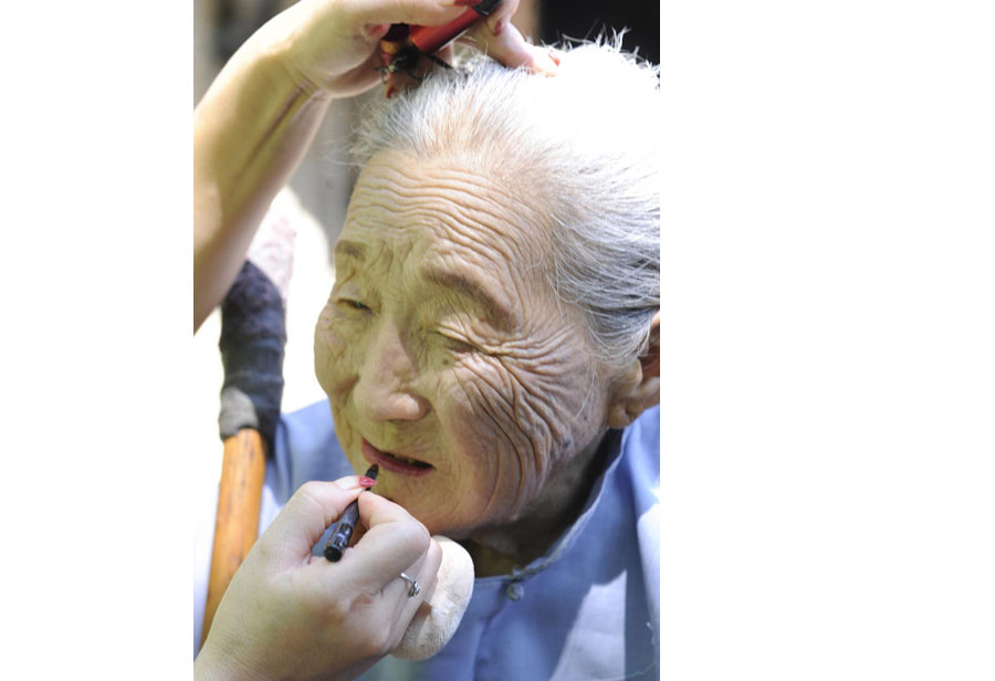 Una voluntaria corta el pelo a Song Qinglin, de 102 a?os, antes de la sesión de fotos para celebrar sus 80 a?os de matrimonio en la aldea Songzhai de Sangying, en el condado Taihe de Fuyang, provincia de Anhui, el 23 de julio de 2016.