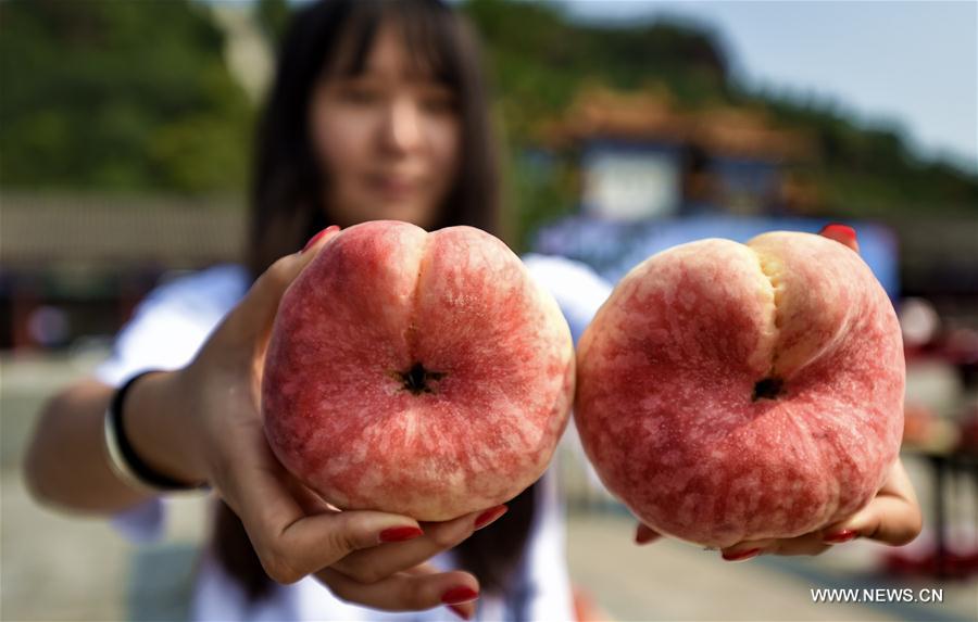 La vendedora de una tienda en línea muestra los melocotones recién recolectados durante el Festival del Melocotón en Liujiadian, distrito Pinggu de Beijing, el 28 de julio de 2016. Más de 100 variedades de melocotones fueron exhibidas en el evento del jueves. El área de cultivo de melocotones en Liujiadian ha superado las 1.200 hectáreas, con una producción de 35.000 toneladas. (Xinhua/Li Xin)
