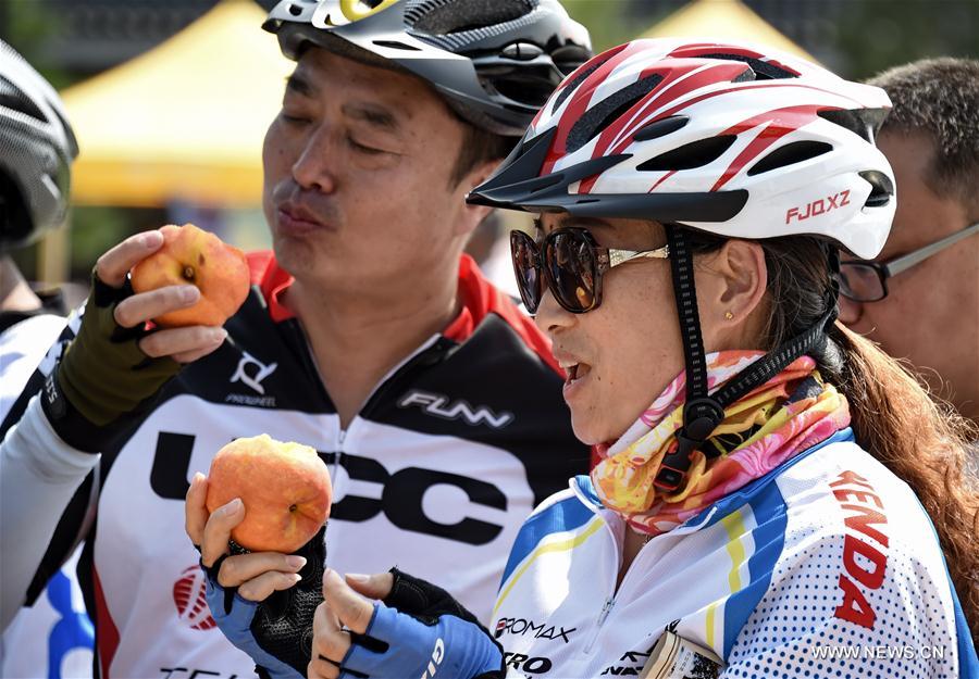 Los ciclistas disfrutan del buen sabor de los melocotones durante el Festival del Melocotón en Liujiadian, distrito Pinggu de Beijing, el 28 de julio de 2016. Más de 100 variedades de melocotones fueron exhibidas en el evento del jueves. El área de cultivo de melocotones en Liujiadian ha superado las 1.200 hectáreas, con una producción de 35.000 toneladas. (Xinhua/Li Xin)