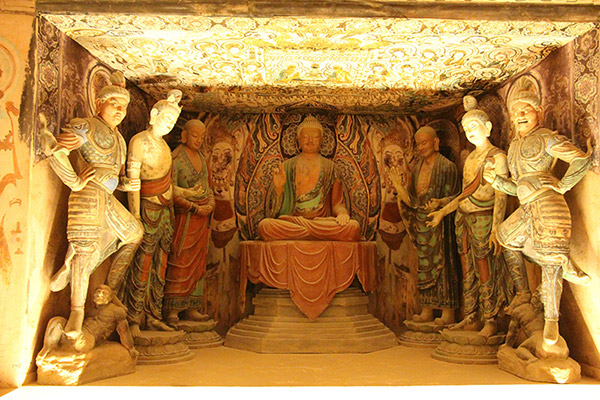 Las grutas de Mogao presentan una enorme colección de arte budista, con más de 2.000 esculturas coloreadas y 45.000 metros cuadrados de frescos en 735 cuevas talladas a lo largo de un barranco. Las grutas de Mogao fueron el primer lugar de China incluido en la Lista de Patrimonio Mundial de la Unesco.