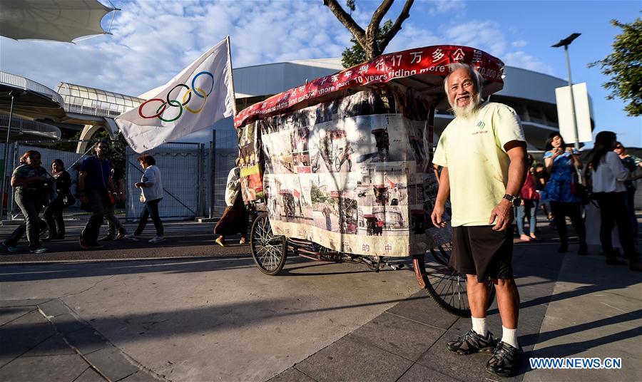 Chen Guanming saluda desde su triciclo, parqueado en Río de Janeiro, Brasil, Julio 31,2016. Es la tercerta vez que Chen Guanming, un agricultor chino de 60 a?os, asiste como espectador a los Juegos Olímpicos. (Foto: Wang Haofei)