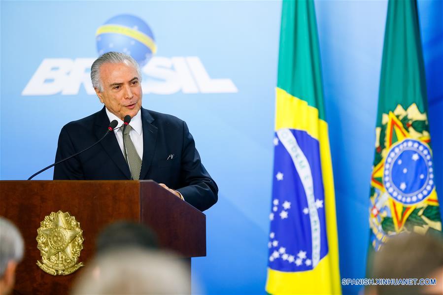 Imagen cedida por Presidencia de Brasil, del presidente interino brasile?o Michel Temer, pronunciando un discurso durante la ceremonia de anuncio de la apertura de mercado para la carne bovina brasile?a, en Brasilia, Brasil, el 1 de agosto de 2016. Brasil y Estados Unidos de América suscribieron el jueves en Washington un acuerdo que permitirá el ingreso de hasta 64,000 toneladas de carne bovina brasile?a fresca al mayor mercado mundial, anunció el gobierno del país sudamericano. (Xinhua/Marcos Correa/Presidencia de Brasil)