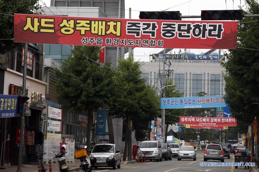 Imagen del 2 de agosto de 2016 de pancartas que expresan oposición al despliegue de la Defensa Terminal de Area a Gran Altitud (THAAD, por sus siglas en inglés), en el condado de Seongju, República de Corea. En cualquier rincón del condado de Seongju se puede percibir el profundo enfado de los habitantes de la zona en la que, tras un acuerdo del gobierno con Estados Unidos de América, se desplegará el sistema antimisiles Defensa Terminal de Area a Gran Altitud (THAAD). En casi todas las partes de Seongju, en el que la instalación está prevista para finales de 2017, se pueden encontrar carteles que muestran el rechazo al escudo antimisiles estadounidense. A mucha gente se le puede ver llevando una cinta alrededor de la cabeza que reza "absoluta objeción al THAAD". (Xinhua/Yao Qilin)