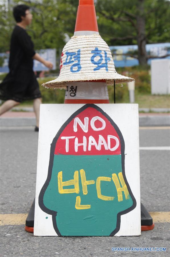 Imagen del 2 de agosto de 2016 de una mujer caminando cerca de un póster que expresa oposición al despliegue de la Defensa Terminal de Area a Gran Altitud (THAAD, por sus siglas en inglés), en el condado de Seongju, República de Corea. En cualquier rincón del condado de Seongju se puede percibir el profundo enfado de los habitantes de la zona en la que, tras un acuerdo del gobierno con Estados Unidos de América, se desplegará el sistema antimisiles Defensa Terminal de Area a Gran Altitud (THAAD). En casi todas las partes de Seongju, en el que la instalación está prevista para finales de 2017, se pueden encontrar carteles que muestran el rechazo al escudo antimisiles estadounidense. A mucha gente se le puede ver llevando una cinta alrededor de la cabeza que reza "absoluta objeción al THAAD". (Xinhua/Yao Qilin)