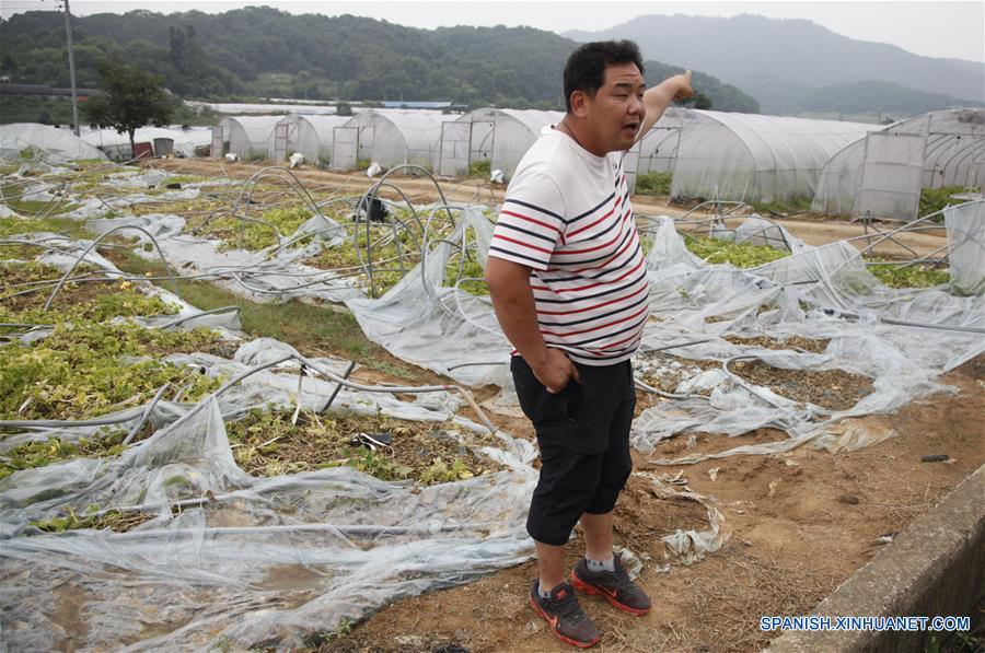 Imagen del 2 de agosto de 2016 del agricultor Shin Jeong-geun, hablando a periodistas acerca del despliegue de la Defensa Terminal de Area a Gran Altitud (THAAD, por sus siglas en inglés), en el condado de Seongju, República de Corea. En cualquier rincón del condado de Seongju se puede percibir el profundo enfado de los habitantes de la zona en la que, tras un acuerdo del gobierno con Estados Unidos de América, se desplegará el sistema antimisiles Defensa Terminal de Area a Gran Altitud (THAAD). En casi todas las partes de Seongju, en el que la instalación está prevista para finales de 2017, se pueden encontrar carteles que muestran el rechazo al escudo antimisiles estadounidense. A mucha gente se le puede ver llevando una cinta alrededor de la cabeza que reza "absoluta objeción al THAAD". (Xinhua/Yao Qilin)