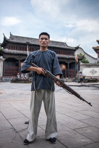 El actor Li Pengfei sostiene un arma antes de rodar una escena en Hengdian. Foto : CFP