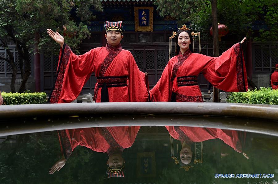 SHANXI, agosto 9, 2016 (Xinhua) -- Una pareja asiste a una boda colectiva llevada a cabo en el Instituto Confucio en Taiyuan, en la provincia de Shanxi, en el norte de China, el 9 de agosto de 2016. Un total de 22 parejas contrajeron nupcias en Taiyuan durante el Festival Qixi, o Día de San Valentín de China, que se celebra el séptimo día del séptimo mes en el calendario lunar chino. (Xinhua/Zhan Yan)