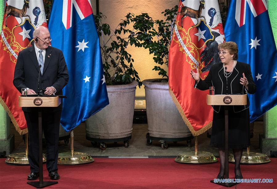 La presidenta de Chile, Michelle Bachelet (d), y el gobernador general de Australia, Peter Cosgrove (i), participan en una conferencia de prensa conjunta en el Palacio de La Moneda, en Santiago, capital de Chile, el 10 de agosto de 2016. De acuerdo con información de la prensa local, el gobernador general de Australia, Peter Cosgrove, se encuentra en Chile como parte de una gira oficial en América Latina. (Xinhua/Jorge Villegas)