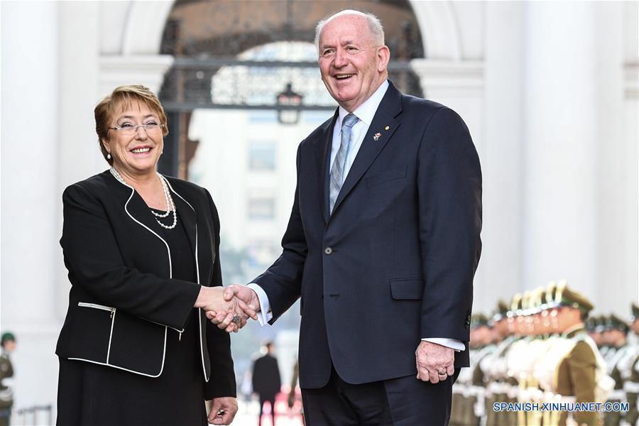 La presidenta de Chile, Michelle Bachelet (i), estrecha la mano con el gobernador general de Australia, Peter Cosgrove (d), durante una ceremonia de bienvenida en el Palacio de La Moneda, en Santiago, capital de Chile, el 10 de agosto de 2016. De acuerdo con información de la prensa local, el gobernador general de Australia, Peter Cosgrove, se encuentra en Chile como parte de una gira oficial en América Latina. (Xinhua/Jorge Villegas)