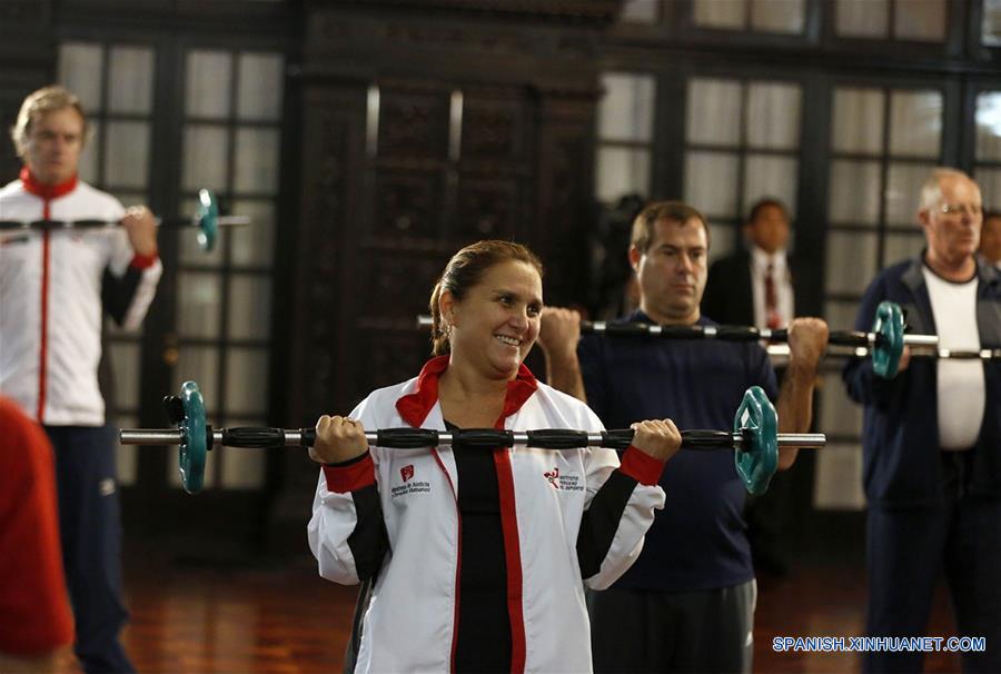 El presidente de Perú, Pedro Pablo Kuczynski (d-atrás), y ministros de Estado del Gobierno peruano participan en una rutina de ejercicios en la sede del Palacio de Gobierno, en Lima, capital de Perú, el 10 de agosto de 2016. De acuerdo con información de la prensa local, ésta es la segunda vez en la que el presidente peruano, Pedro Pablo Kuczynski, y sus ministros de Estado efectúan actividades físicas, como una medida para promover la vida saludable y la práctica del deporte, para mejorar la salud y el bienestar de las familias peruanas. (Xinhua/Presidencia de Perú/ANDINA)