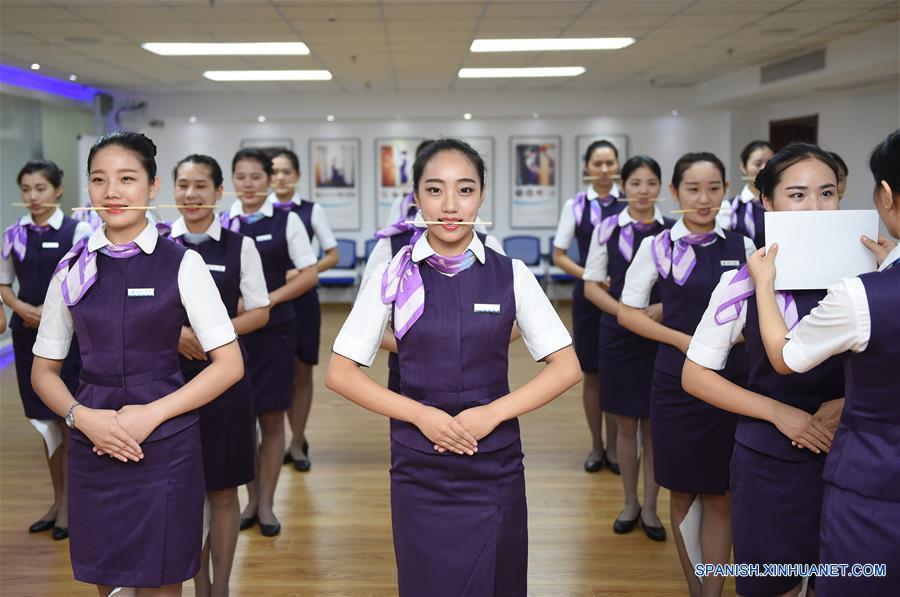 ZHEJIANG, agosto 17, 2016 (Xinhua) -- Azafatas participan en un curso de formación en Hangzhou, capital de la provincia de Zhejiang, en el este de China, el 17 de agosto de 2016.