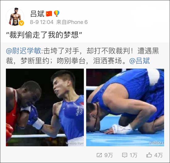 Asi definió su última pelea en Río 2016, donde quedó eliminado del camino hacia el oro el boxeador chino Lv Bin en su cuenta de Weibo. En polémica pelea, celebrada el 8 de agosto, Lv enfrentó a Peter Mungai Warui, de Kenya, en la categoría de 49 kilogramos.