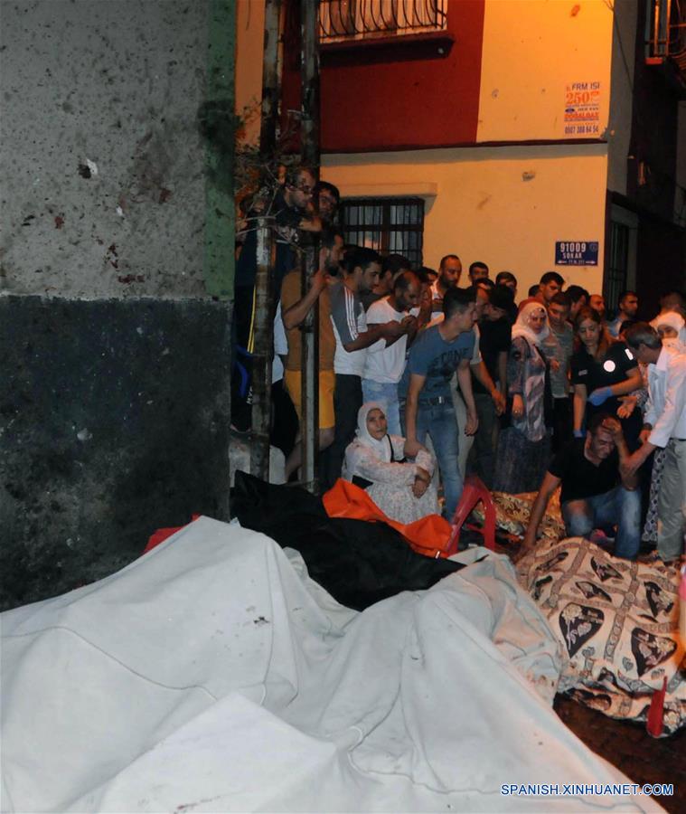 Familiares revisan los cuerpos de las víctimas después de una explosión en el distrito Sahinbey de la provincia de Gaziantep, en el sureste de Turquía, el 20 de agosto de 2016. Una explosión ocurrió el sábado por la noche cerca de un salón de bodas dejando por lo menos 22 personas muertas y 94 heridas, informó la oficina del gobernador de Gaziantep. (Xinhua/Mert Macit)
