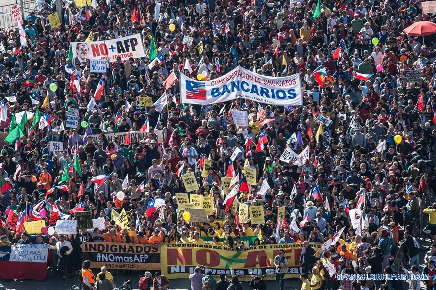 SANTIAGO, agosto 21, 2016 (Xinhua) -- Manifestantes participan en la multitudinaria marcha nacional "No Más AFP" convocada por la Coordinadora Nacional de "No Más AFP" y otras organizaciones sociales, en Santiago, capital de Chile, el 21 de agosto de 2016. La marcha tiene como objetivo fundamental rechazar el funcionamiento de las Administradores de Fondos de Pensiones (AFP), y como principales demandas, crear un sistema de Seguridad Social, de reparto, solidario y financiamiento tripartito (trabajadores, empresas y Estado), que pague pensiones que alcancen para vivir bien a los jubilados y rechazar el funcionamiento de las AFP, según los organizadores. (Xinhua/Jorge Villegas)