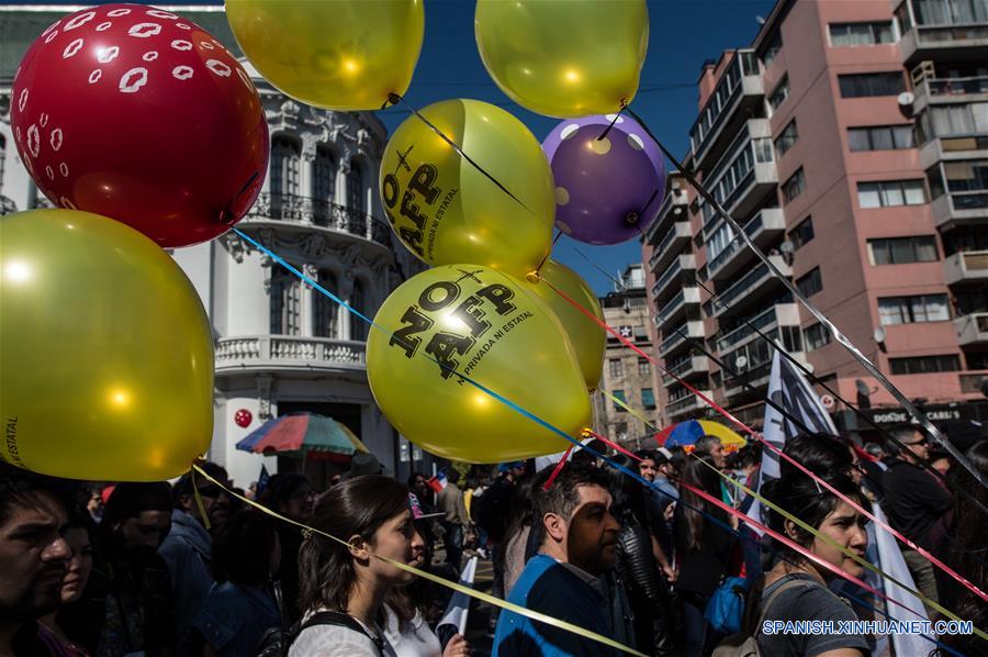 SANTIAGO, agosto 21, 2016 (Xinhua) -- Manifestantes participan en la multitudinaria marcha nacional "No Más AFP" convocada por la Coordinadora Nacional de "No Más AFP" y otras organizaciones sociales, en Santiago, capital de Chile, el 21 de agosto de 2016. La marcha tiene como objetivo fundamental rechazar el funcionamiento de las Administradores de Fondos de Pensiones (AFP), y como principales demandas, crear un sistema de Seguridad Social, de reparto, solidario y financiamiento tripartito (trabajadores, empresas y Estado), que pague pensiones que alcancen para vivir bien a los jubilados y rechazar el funcionamiento de las AFP, según los organizadores. (Xinhua/Jorge Villegas)