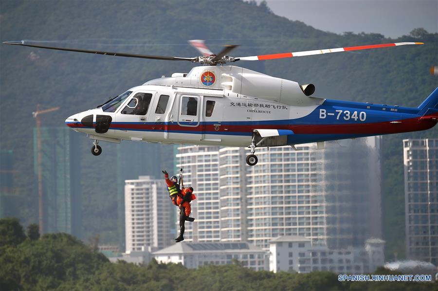 Un helicóptero demuestra cómo rescatar a personas que cayeron al agua durante un simulacro de rescate de emergencia llevado a cabo en la zona del mar cerca de la isla Fenghuang en Sanya, provincia de Hainan, en el sur de China, el 23 de agosto de 2016. El simulacro está destinado a mejorar la capacidad de respuesta de emergencia de los equipos de salvamento marítimo. (Xinhua/Guo Cheng)