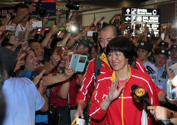 El Aeropuerto Internacional de Beijing recibió entre cientos de seguidores al equipo de voleibol femenino en su regreso al país el martes por la noche. [Foto de Zou Hong/China Daily]