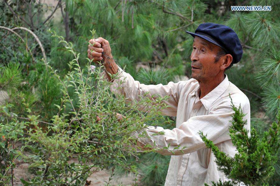 Xu Zhiqiang, de 68 a?os, arranca la maleza que crece junto a los árboles plantados en una monta?a de la aldea Zhangchuan en el condado Tongwei, provincia de Gansu, el 23 de agosto de 2016. Xu Zhiqiang y su hermano gemelo Xu Zhigang llevan 48 a?os plantando voluntariamente árboles en las colinas estériles en la meseta Loess. Más de 350 mu (23 hectáreas) de tierras yermas han vuelto a ser verdes gracias la plantación de más de 80.000 árboles y flores. Los esfuerzos de los hermanos no sólo ayudan a crear belleza natural sino también a mejorar el ecosistema local. (Xinhua/Guo Gang)