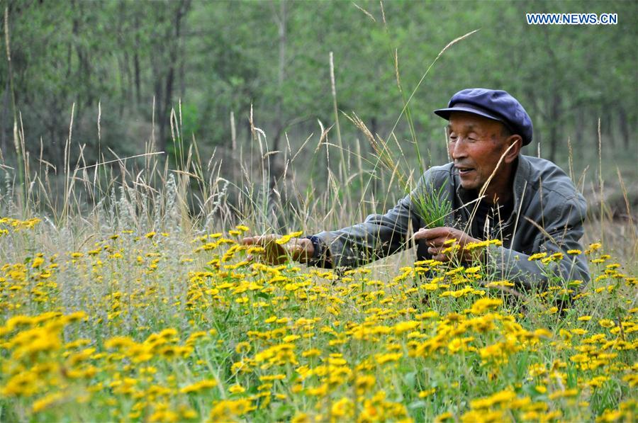 Xu Zhiqiang, de 68 a?os, arranca la maleza que crece junto a los árboles plantados en una monta?a de la aldea Zhangchuan en el condado Tongwei, provincia de Gansu, el 23 de agosto de 2016. Xu Zhiqiang y su hermano gemelo Xu Zhigang llevan 48 a?os plantando voluntariamente árboles en las colinas estériles en la meseta Loess. Más de 350 mu (23 hectáreas) de tierras yermas han vuelto a ser verdes gracias la plantación de más de 80.000 árboles y flores. Los esfuerzos de los hermanos no sólo ayudan a crear belleza natural sino también a mejorar el ecosistema local. (Xinhua/Guo Gang)