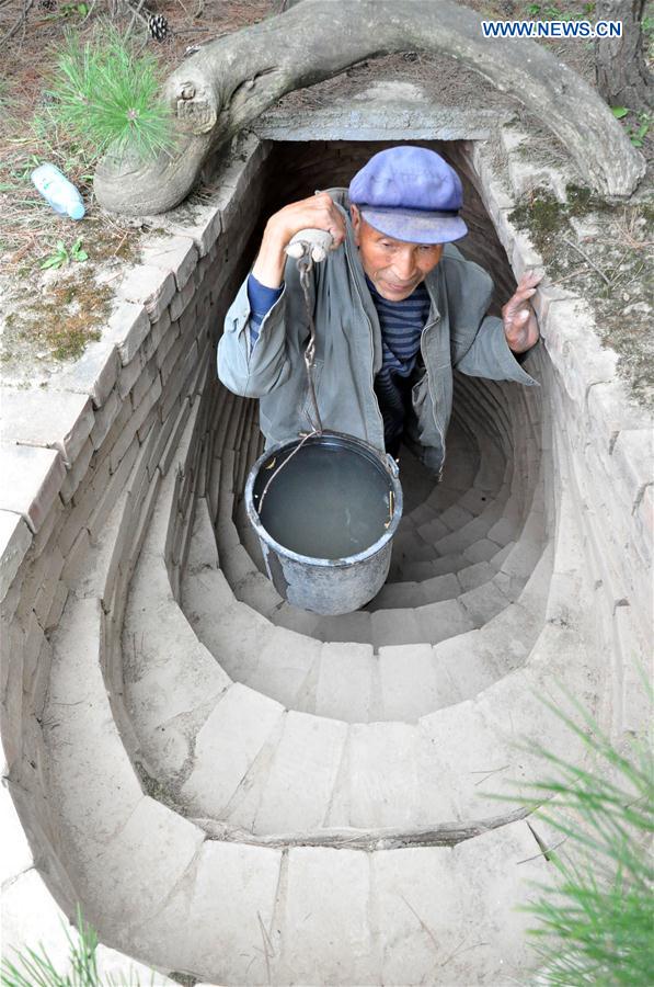 Gansu,25/08/2016 (El Pueblo en Línea) - Xu Zhiqiang, de 68 a?os, lleva agua a hombros por un túnel construido a él mismo, preparándose para regar árboles plantados en una monta?a de la aldea Zhangchuan en el condado Tongwei, provincia de Gansu, el 23 de agosto de 2016. Xu Zhiqiang y su hermano gemelo Xu Zhigang llevan 48 a?os plantando voluntariamente árboles en las colinas estériles en la meseta Loess. Más de 350 mu (23 hectáreas) de tierras yermas han vuelto a ser verdes gracias la plantación de más de 80.000 árboles y flores. Los esfuerzos de los hermanos no sólo ayudan a crear belleza natural sino también a mejorar el ecosistema local. (Xinhua/Guo Gang)