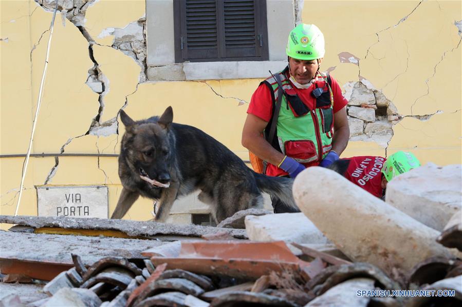Un rescatista con un perro de búsqueda permanece entre los escombros de edificaciones colapsadas luego de un sismo en la localidad de Amatrice, provincia de Rieti, en el centro de Italia, el 24 de agosto de 2016. Al menos 120 personas han muerto a causa de un fuerte sismo ocurrido el miércoles en el centro de Italia, dijo en una conferencia de prensa en Rieti el primer ministro italiano Matteo Renzi. Un sismo de magnitud 6.2 en la escala de Richter, con una profundidad de 4.2 kilómetros, sacudió a las 03:36 hora local de hoy (01:36 GMT) una zona monta?osa cercana a la ciudad de Rieti, a cerca de 140 kilómetros al noreste de Roma, informó el Instituto Nacional de Vulcanología y Sismología (INGV). (Xinhua/Imago/ZUMAPRESS)
