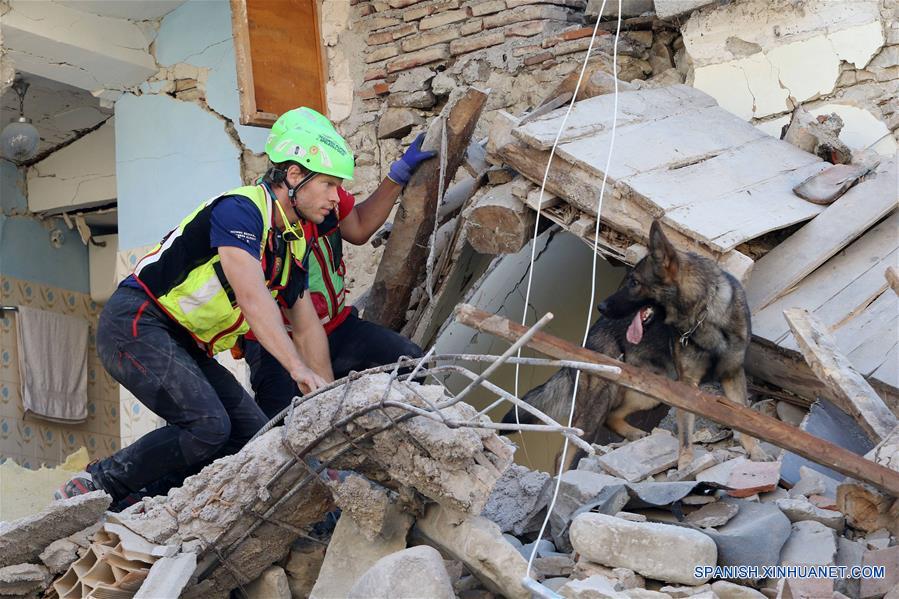 Rescatistas con un perro de búsqueda trabajan entre los escombros de un edificio colapsado luego de un sismo en la localidad de Amatrice, provincia de Rieti, en el centro de Italia, el 24 de agosto de 2016. Al menos 120 personas han muerto a causa de un fuerte sismo ocurrido el miércoles en el centro de Italia, dijo en una conferencia de prensa en Rieti el primer ministro italiano Matteo Renzi. Un sismo de magnitud 6.2 en la escala de Richter, con una profundidad de 4.2 kilómetros, sacudió a las 03:36 hora local de hoy (01:36 GMT) una zona monta?osa cercana a la ciudad de Rieti, a cerca de 140 kilómetros al noreste de Roma, informó el Instituto Nacional de Vulcanología y Sismología (INGV). (Xinhua/Imago/ZUMAPRESS)