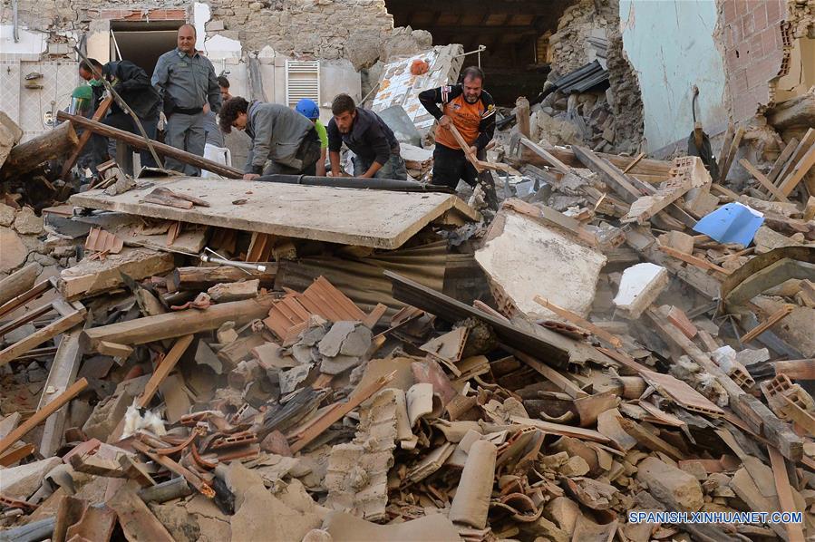 Personas buscan entre los escombros de una vivienda colapsada luego de un sismo en la localidad de Amatrice, provincia de Rieti, en el centro de Italia, el 24 de agosto de 2016. Al menos 73 es la cifra de muertes causadas por un fuerte sismo ocurrido el miércoles en el centro de Italia, confirmó la agencia de protección civil italiana. El sismo de magnitud 6,0 en la escala de Richter sacudió la ciudad de Rieti a las 3:32 horas de hoy (01:32 GMT), a una profundidad de 4,2 kilómetros, dijo el Instituto Nacional de Vulcanología y Sismología. (Xinhua/Vannicelli/Rex Shutterstock/ZUMAPRESS)