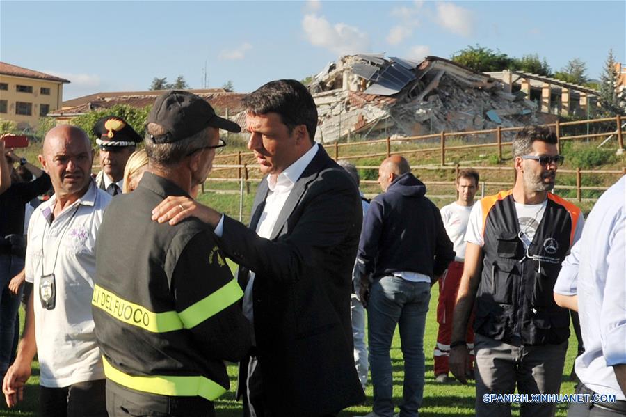 El primer ministro de Italia, Matteo Renzi (c), se detiene a saludar a un bombero durante su visita de supervisión luego de un sismo en la localidad de Amatrice, provincia de Rieti, en el centro de Italia, el 24 de agosto de 2016. Al menos 73 es la cifra de muertes causadas por un fuerte sismo ocurrido el miércoles en el centro de Italia confirmó la agencia de protección civil italiana. El sismo de magnitud 6,0 en la escala de Richter sacudió la ciudad de Rieti a las 3:32 horas de hoy (01:32 GMT), a una profundidad de 4,2 kilómetros, dijo el Instituto Nacional de Vulcanología y Sismología. (Xinhua/Italy Photo Press/ZUMAPRESS)