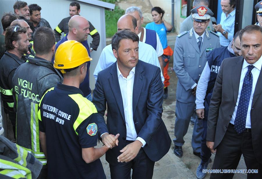 El primer ministro de Italia, Matteo Renzi (c-frente), saluda a un operador de Protección Civil durante su visita de supervisión luego de un sismo en la localidad de Amatrice, provincia de Rieti, en el centro de Italia, el 24 de agosto de 2016. Al menos 73 es la cifra de muertes causadas por un fuerte sismo ocurrido el miércoles en el centro de Italia confirmó la agencia de protección civil italiana. El sismo de magnitud 6,0 en la escala de Richter sacudió la ciudad de Rieti a las 3:32 horas de hoy (01:32 GMT), a una profundidad de 4,2 kilómetros, dijo el Instituto Nacional de Vulcanología y Sismología. (Xinhua/Italy Photo Press/ZUMAPRESS)