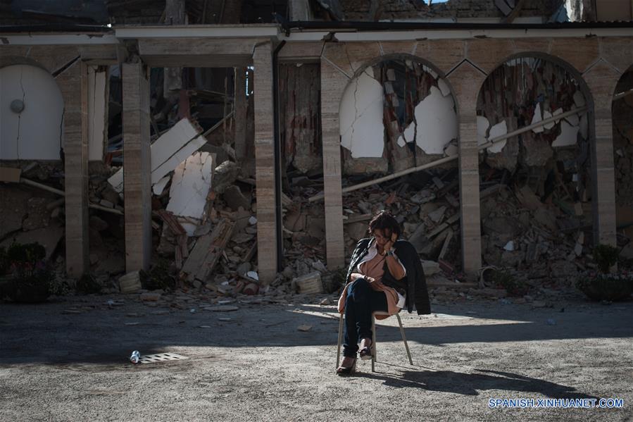 Una residente espera sentada en el exterior de una edificación da?ada luego de un sismo en la localidad de Amatrice, provincia de Rieti, en el centro de Italia, el 24 de agosto de 2016. Al menos 120 personas han muerto a causa de un fuerte sismo ocurrido el miércoles en el centro de Italia, dijo en una conferencia de prensa en Rieti el primer ministro italiano Matteo Renzi. Un sismo de magnitud 6.2 en la escala de Richter, con una profundidad de 4.2 kilómetros, sacudió a las 03:36 hora local de hoy (01:36 GMT) una zona monta?osa cercana a la ciudad de Rieti, a cerca de 140 kilómetros al noreste de Roma, informó el Instituto Nacional de Vulcanología y Sismología (INGV). (Xinhua/Ivan Romano/Pacific Press/ZUMAPRESS)