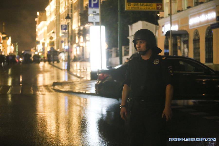 Un policía vigila cerca del banco donde ocurrió un secuestro, en Moscú, Rusia, el 24 de agosto de 2016. Cuatro empleados de un banco del centro de Moscú fueron tomados como rehenes dentro del banco. De los cuatro empleados retenidos, dos mujeres fueron liberadas. Las fuerzas del orden han llegado ya al lugar de los hechos. Aún se desconoce la identidad de los responsables, informaron medios locales. (Xinhua/Evgeny Sinitsyn)