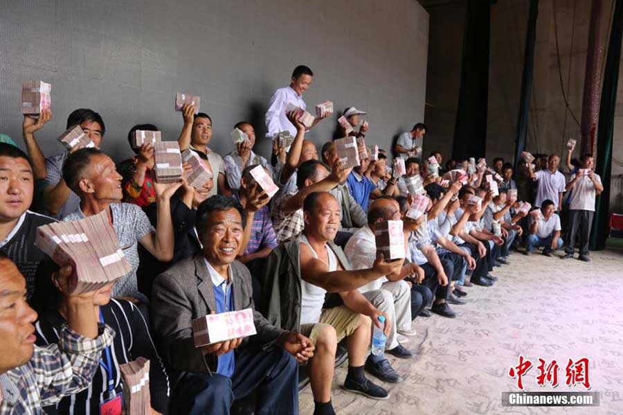 Alrededor de 5,6 millones de yuanes (850.000 dólares) se distribuyeron el sábado entre 80 familias que participaron en un programa de plantación de árboles en un pueblo del condado de Lintao, en la provincia de Gansu. [Foto / Chinanews.com]