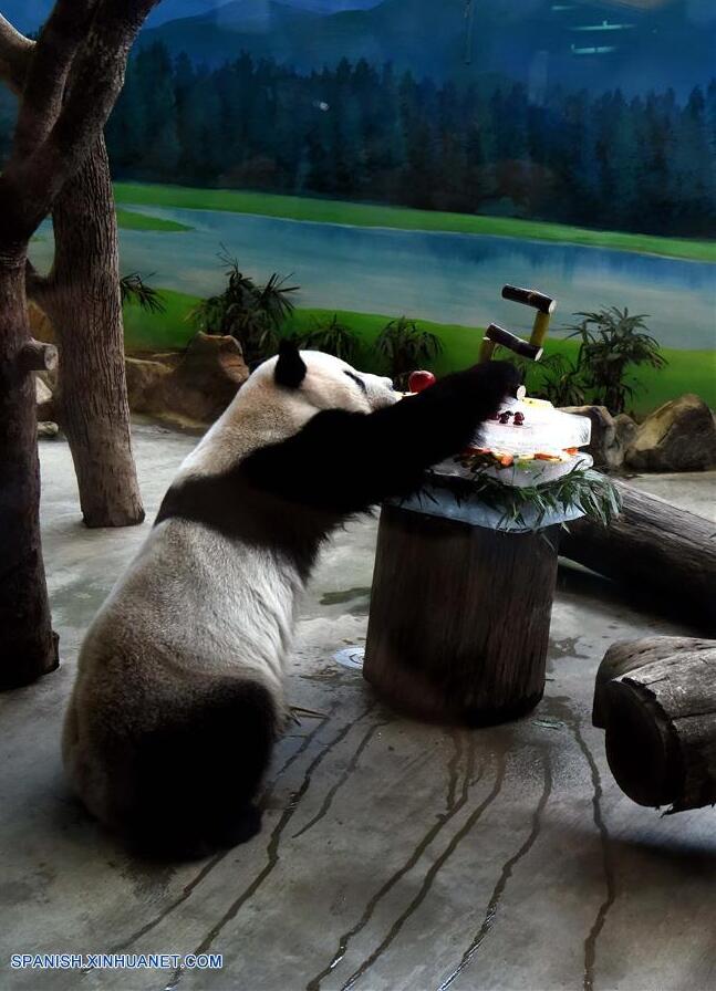 TAIPEI, agosto 30, 2016 (Xinhua) -- El panda gigante Tuan Tuan disfruta un pastel de cumplea?os especial en el Zoológico de Taipei, en Taipei, en Taiwan, en el sureste de China, el 30 de agosto de 2016. Nacido dos días después que Yuan Yuan en 2004, el panda gigante Tuan Tuan también celebró su cumplea?os número 12 junto a Yuan Yuan el martes. Yuan Yuan y Tuan Tuan fueron entregados a Taiwan por la parte continental de China, como regalo de buena voluntad en 2008. Ellos tuvieron su primer cachorro, Yuan Zai, el 6 de julio de 2013. (Xinhua/Song Zhenping)