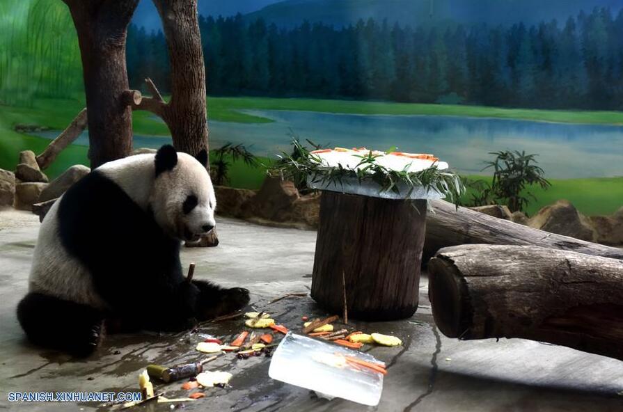 TAIPEI, agosto 30, 2016 (Xinhua) -- El panda gigante Tuan Tuan disfruta un pastel de cumplea?os especial en el Zoológico de Taipei, en Taipei, en Taiwan, en el sureste de China, el 30 de agosto de 2016. Nacido dos días después que Yuan Yuan en 2004, el panda gigante Tuan Tuan también celebró su cumplea?os número 12 junto a Yuan Yuan el martes. Yuan Yuan y Tuan Tuan fueron entregados a Taiwan por la parte continental de China, como regalo de buena voluntad en 2008. Ellos tuvieron su primer cachorro, Yuan Zai, el 6 de julio de 2013. (Xinhua/Song Zhenping)